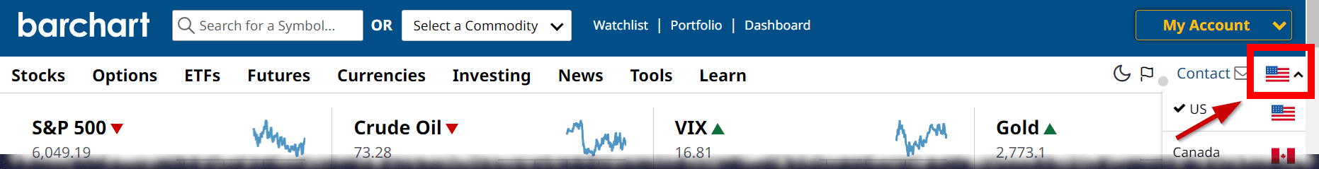 Nach dem ersten Aufruf startet barchart.com mit US-Lokalisation. Das können Sie ändern. Oben am rechten Rand der Menüzeile sehen Sie ein kleines Flaggen-Symbol, über das Sie die Lokalisierung auf Kanada, UK, Australien oder EU umstellen. So fixiert sich das System auf die jeweiligen Märkte der ausgewählten Region.
