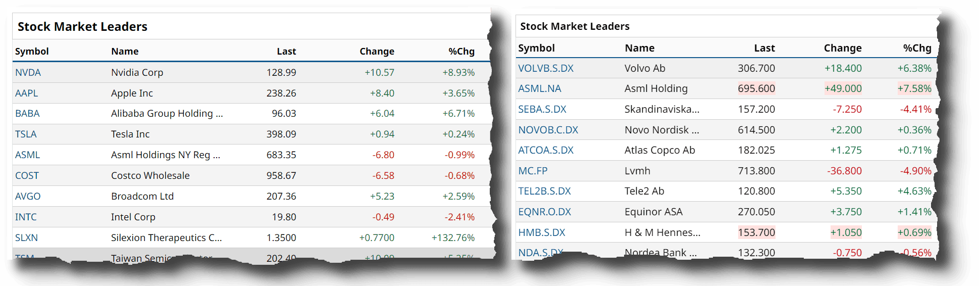 Es folgen die “Stock Market Leaders” mit hervorstechenden Aktienkursen. Hier unterscheiden sich die US- und die EU- Version.