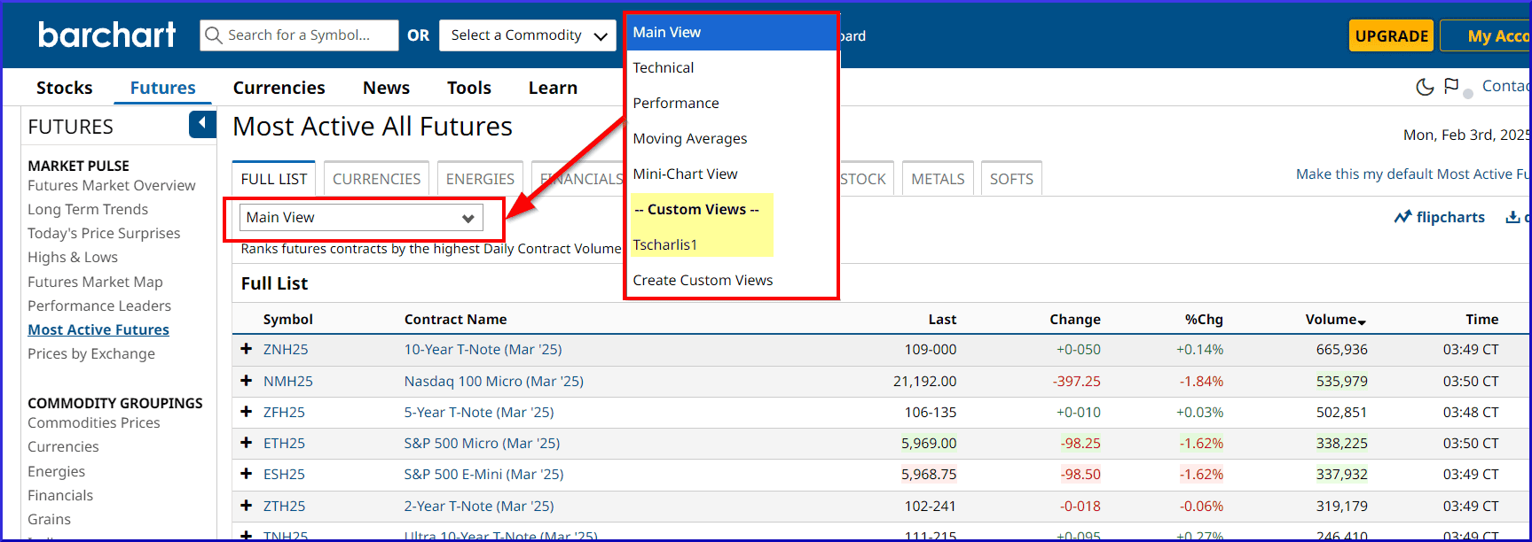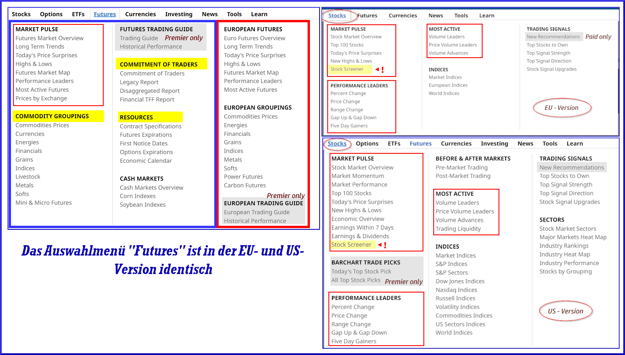In der folgenden Abbildung Sehen Sie Beispiele für die Menüs “Futures” und “Stocks”. (Einige Menüoptionen sind nur in den Bezahlversionen nutzbar, hier werden Sie jeweils auf eine Werbeseite weitergeleitet, die Ihnen die Tarife erläutert.)