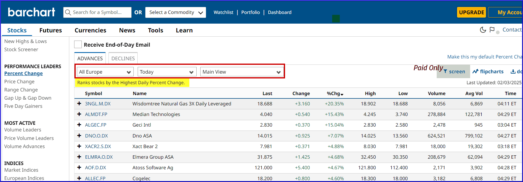- Ungeschlagen, und mit TradingView nicht zu vergleichen, ist Barchart jedoch im Hinblick auf Information und Wissensvermittlung. Für den aktiven und (semi)professionellen Trader bietet es eine “ALL-In-One” Lösung, beginnend bei Nachrichten und Marktinformationen, Analysen bis hin zur Planung der eigenen Handelsaktivität.