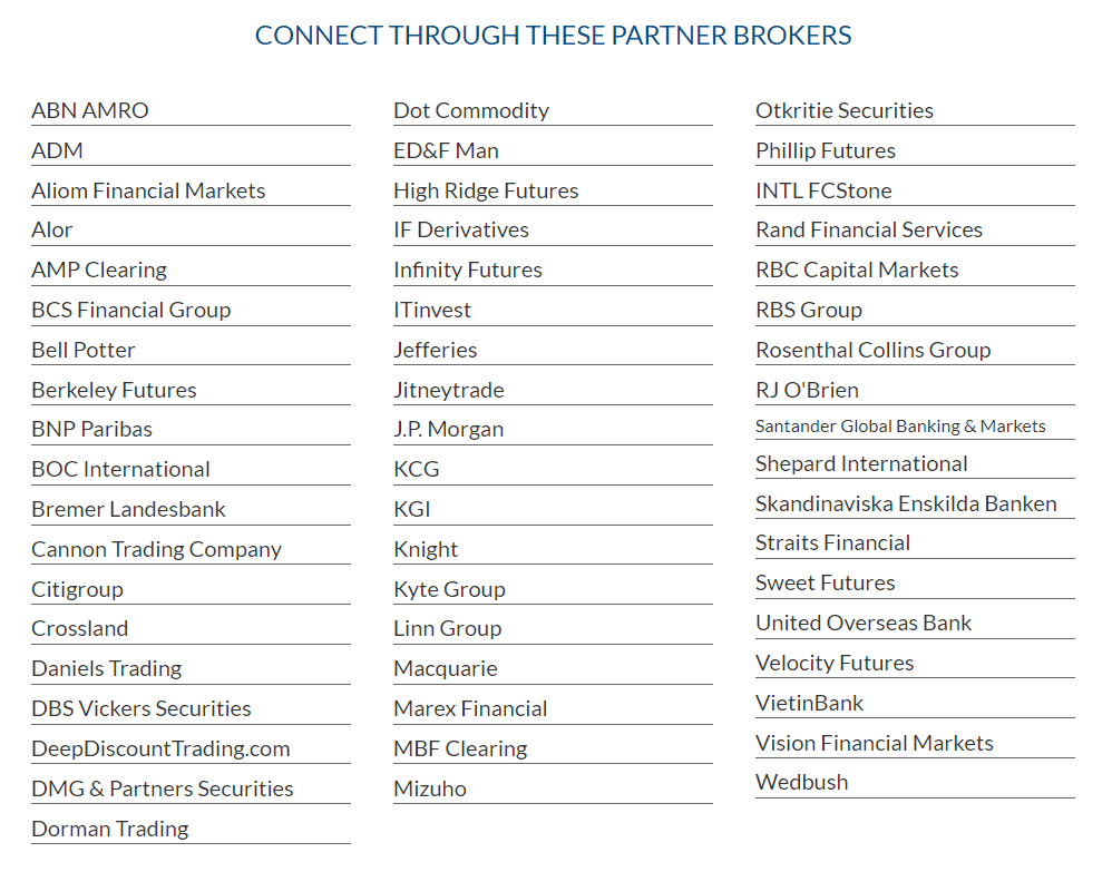 - Barchart bietet keine Option, aktiv aus dem Chart heraus zu traden. Allerdings existiert mit dem “Barchart Trader” (https://www.barchart.com/trader) eine Anwendung mit der Möglichkeit, sog. “Workspaces” zu erstellen. Dabei handelt es sich um eine Benutzeroberfläche, die frei konfigurierbar beliebige Features von barchart.com (Charts, Listen …) vereint. Diesen Dienst kann man mit dem eigenen Broker verbinden. Dies verlang jedoch einen CQG-Broker. Der Screenshot listet die möglichen Broker auf:
