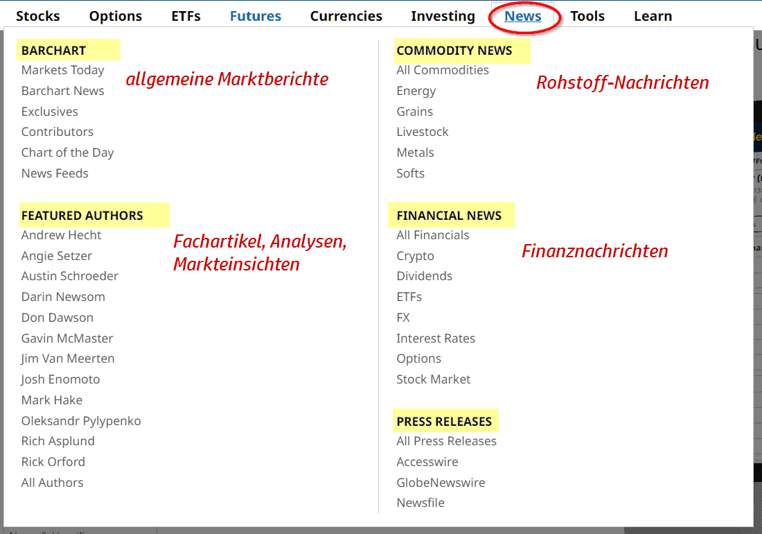 Ein breitgefächertes Angebot an aktuellen Nachrichten und Marktanalysen sowie grundlegende Schulungen und Webinaren zu Wirtschafts- und Finanzthemen rundet das Angebot von barchart.com ab.