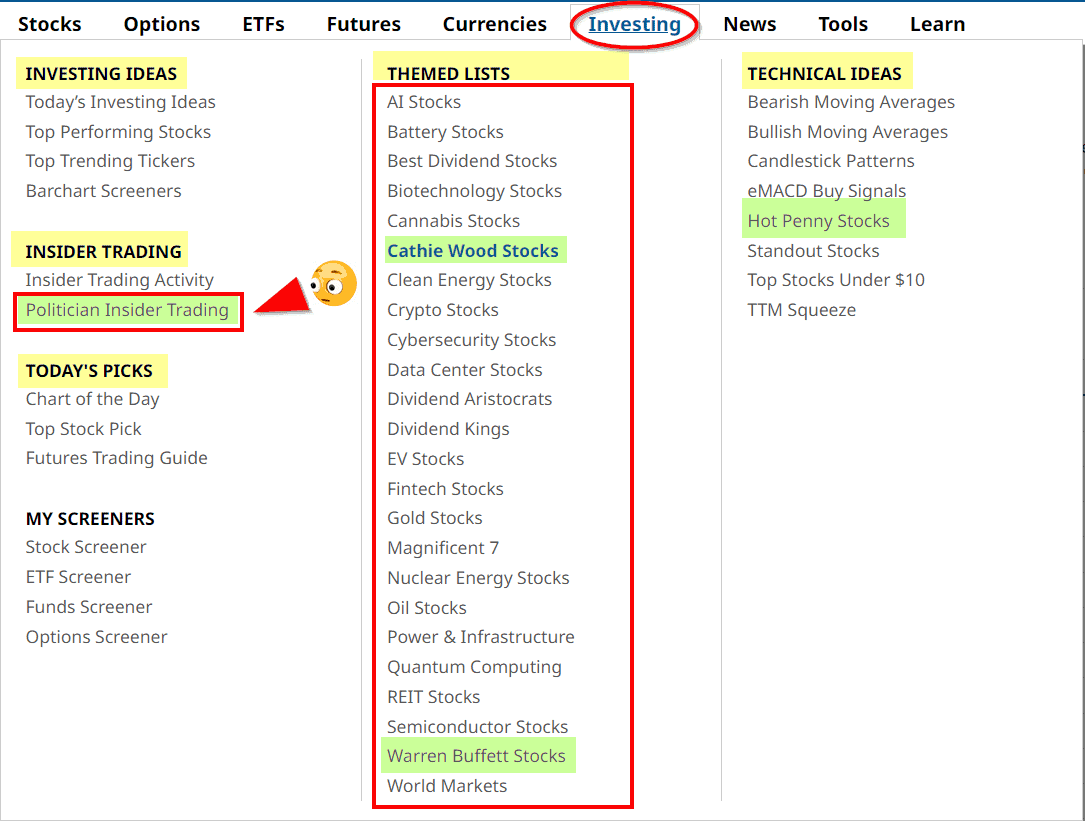 Eine Reihe interessanter (und überraschender) Informationen und Auflistungen finden Sie im Menüpunkt “Investing” des US-Lokalisierung. Ein intensiver Blick lohnt – es kommen überraschende Dinge zutage!