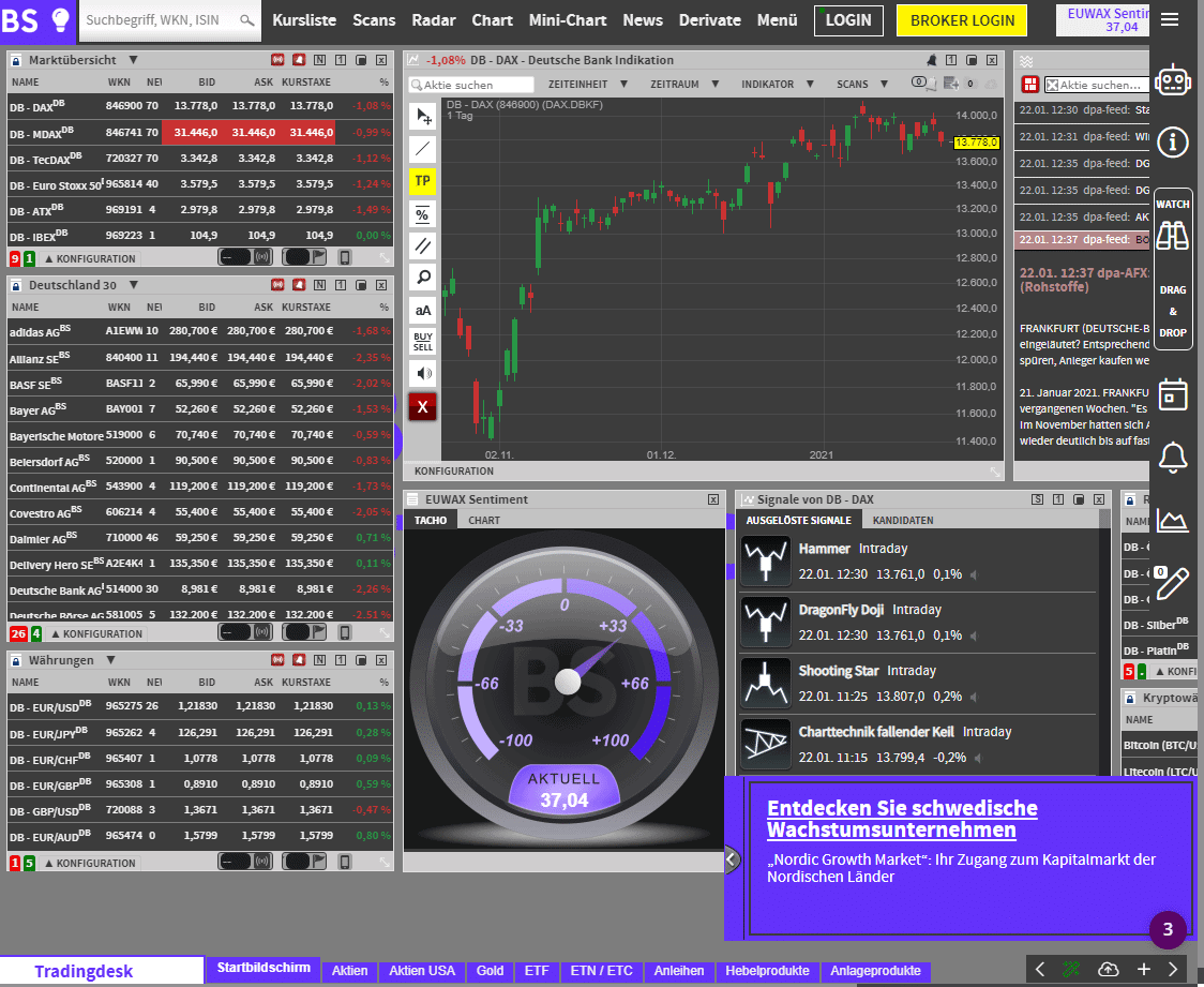 Es gibt eine Marktübersicht mit der man einen Überblick über die wichtigsten Märkte, wie Indizes, Anleihen, Währungen oder Rohstoffe erhält.