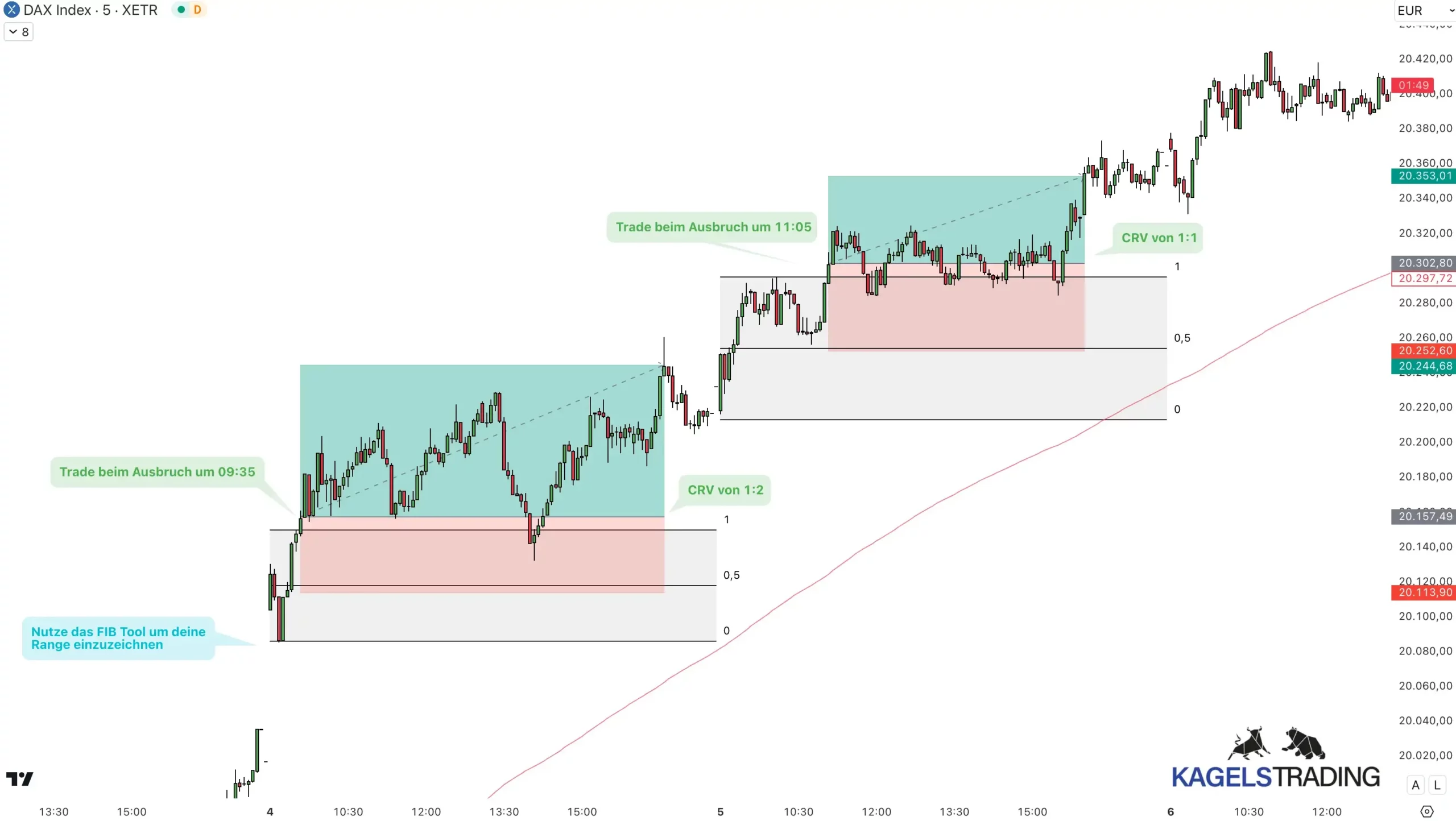 Sobald der Kurs nach Ablauf der 30 Minuten über das definierte Hoch oder unter das definierte Tief der Opening Range ausbricht, erhältst du ein Einstiegssignal. Um den Ausbruch zu bestätigen, kannst du kleinere Zeiteinheiten wie 1-, 5- oder 10-Minuten-Charts nutzen. Der Einstieg erfolgt zum Beispiel, sobald eine Kerze vollständig außerhalb der Range schließt. Auch hier empfiehlt es sich, verschiedene Einstellungen zu testen, um das für dich optimale Setup zu finden.