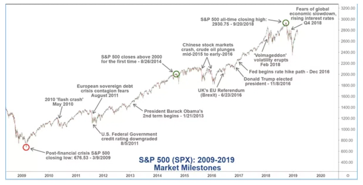 Der Schlusskurs des S&P 500 lag im Oktober 2009 bei genau 676,53 Punkten. Zum Börsenschluss am 9. Oktober 2019 lag der S&P 500 bei 2.919,40 Punkten. Dies ist ein Anstieg von 330 % in den ersten 10 Jahren. Bis 2020 erreicht das Wachstum einen Wert von 475,72 % (Quelle: Offical Data Foundation). Doch auch diese Phase war nicht nur von Hochphasen geprägt, wie diese Grafik zeigt: