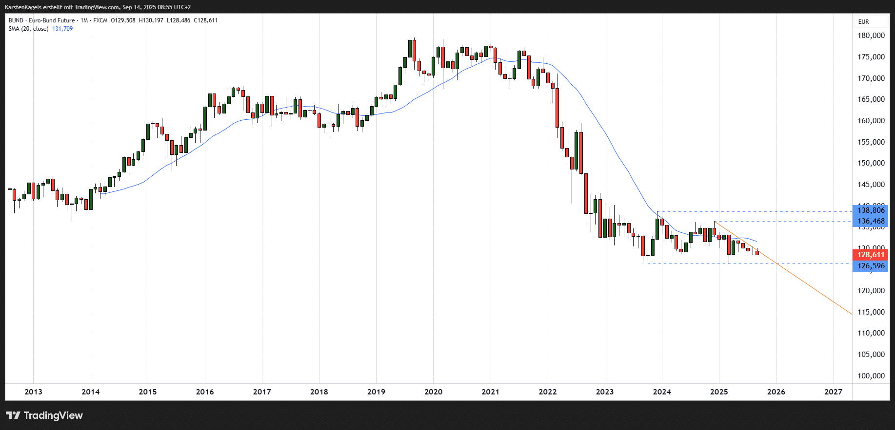 - Mittelfristige Bund-Future Prognose 2025-2026: Erst ein Ausbruch aus der etablierten Seitwärtsphase würde den Richtungsimpuls für die nächste Serie an Kursgewinnen oder -verlusten liefern. Damit bilden die Niveaus bei 126 und 132 Punkten die entsprechenden Auslöser.