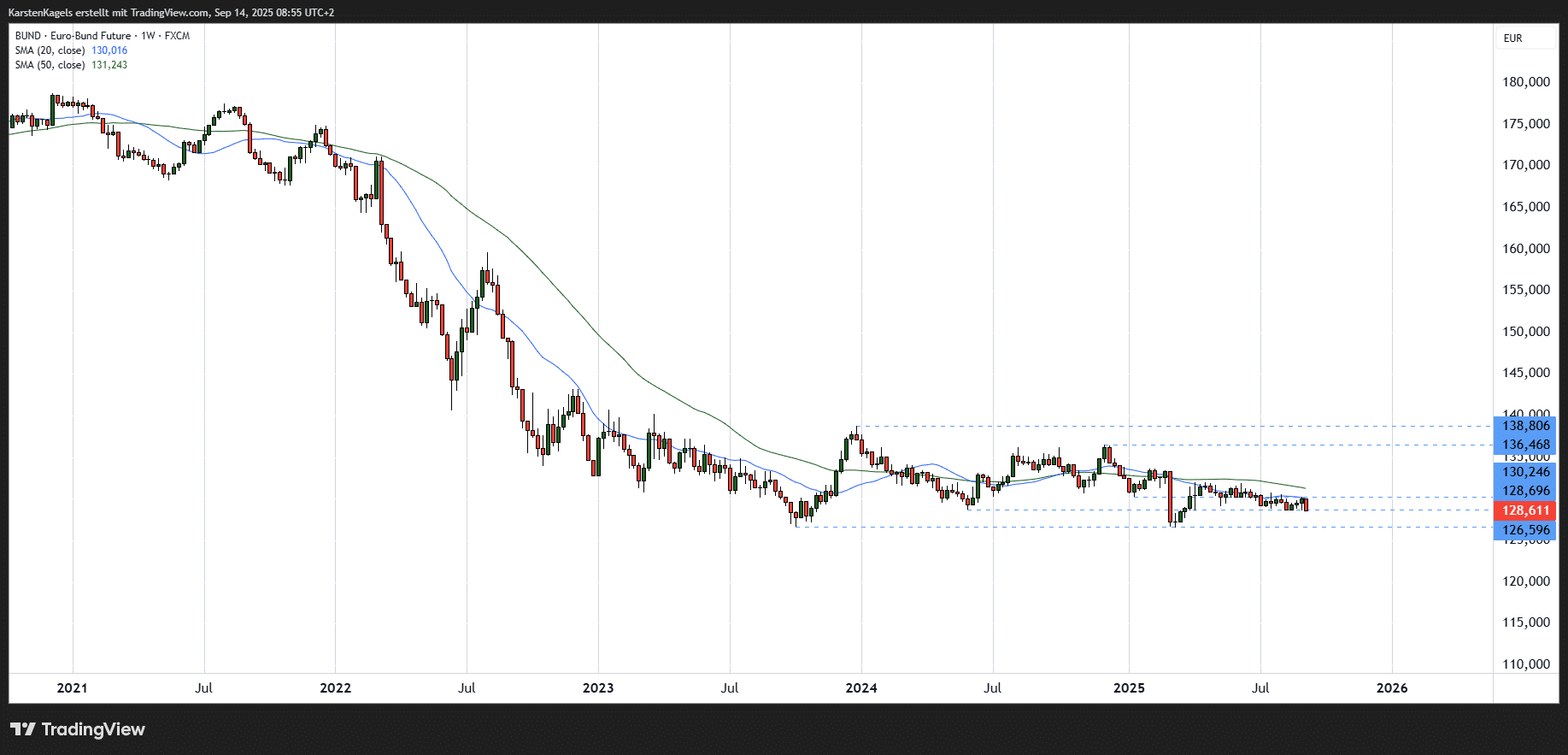 Rückblick: Der abgebildete Wochenchart bildet die Kursentwicklung des Bund Futures seit dem Jahr 2021 ab. Nachdem das Jahr 2022 von stärkeren Verlusten geprägt war, deutet sich seit 2023 eine Bodenbildung an. Hier bleibt die untere Grenze bei 126 Punkten jedoch gefährdet.