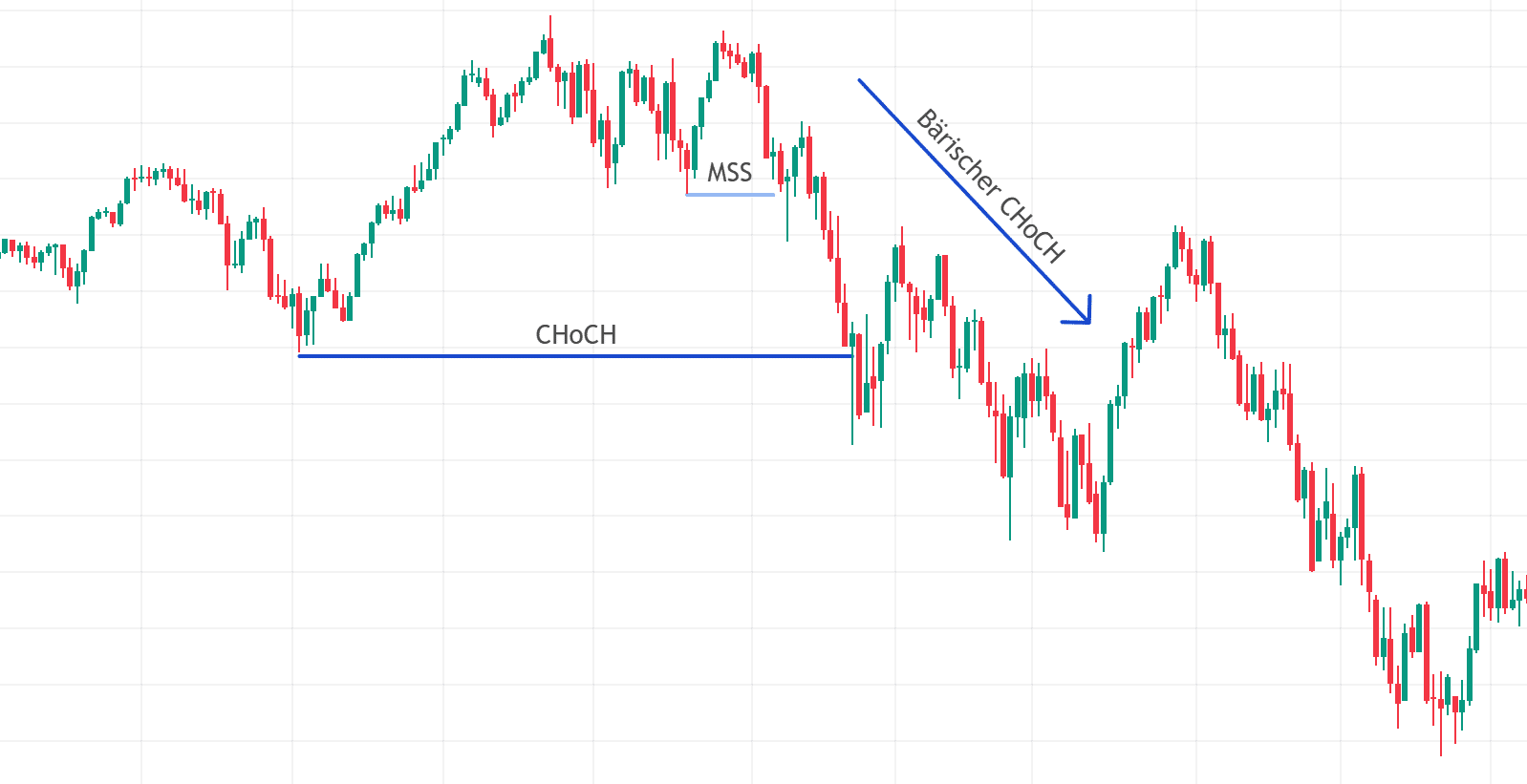 Ein bärischer CHoCH tritt auf, wenn der Markt nach einem Aufwärtstrend