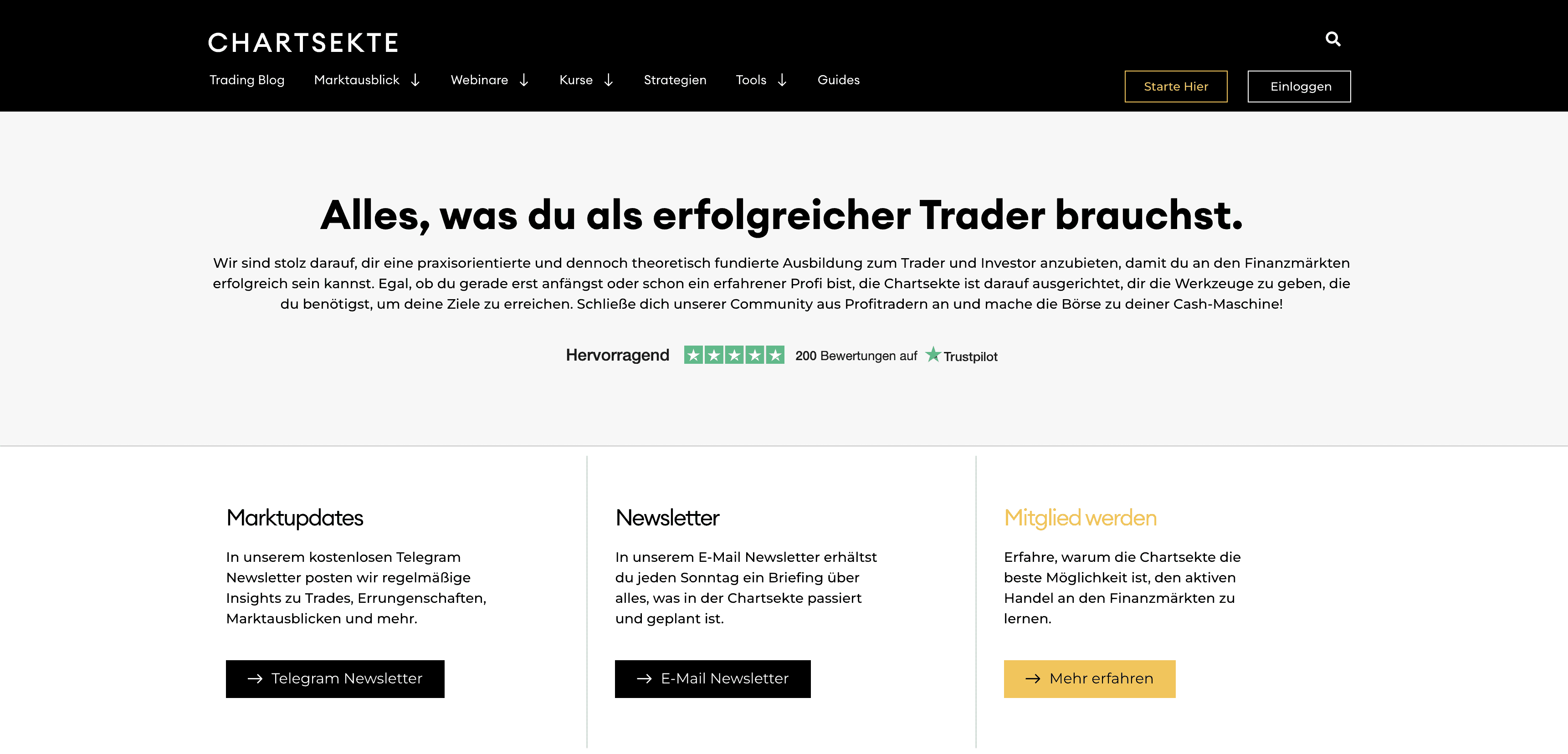 Die Chartsekte ist eine aufstrebende Community, die sich auf die Ausbildung und Unterstützung von Tradern und Investoren spezialisiert hat. Obwohl sie noch relativ neu auf dem Markt ist, hat sie sich bereits einen Namen gemacht, indem sie eine praxisorientierte Ausbildung mit ständig neuen Inhalten im Bereich des Tradings anbietet.