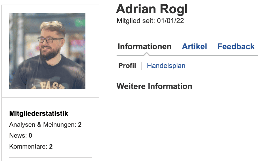 Das Bild zeigt das Profil von Adrian Rogl auf investing.com.