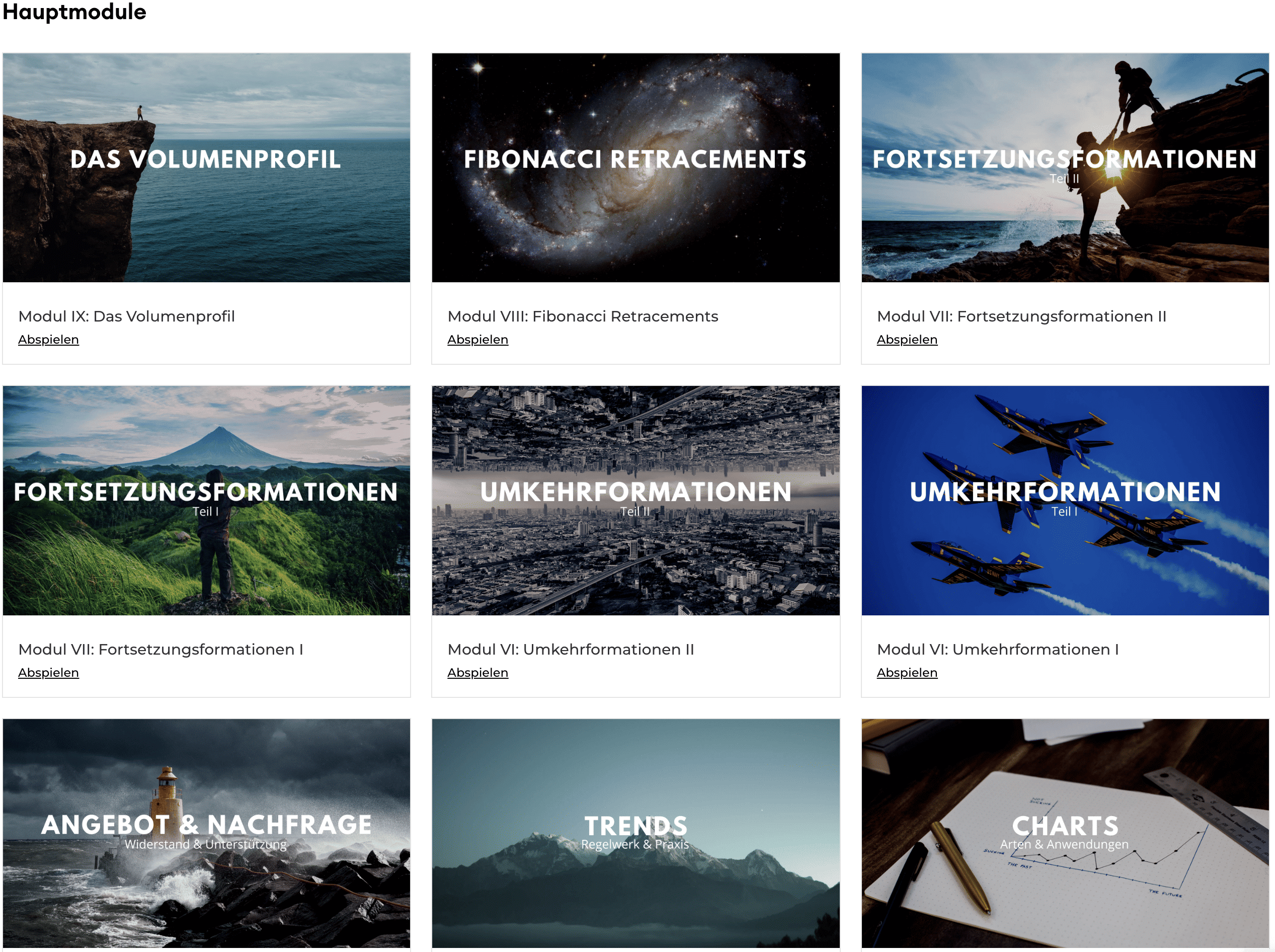 • Der Grundlagenkurs von Adrian bietet eine solide Einführung in die technische Analyse und Chartanalyse. Dieser Kurs ist ideal für Anfänger und wird regelmäßig um neue Module erweitert.