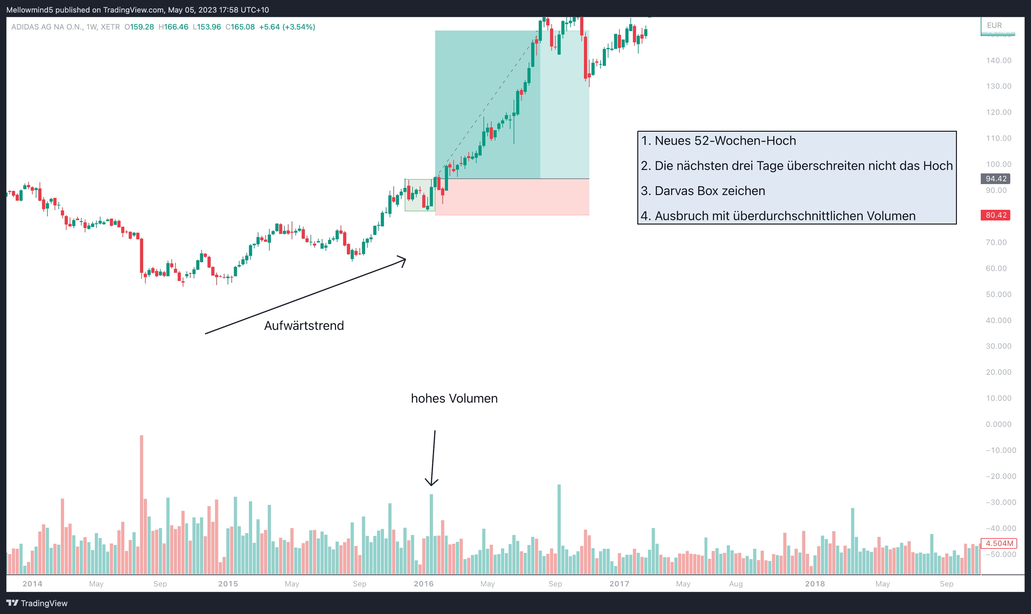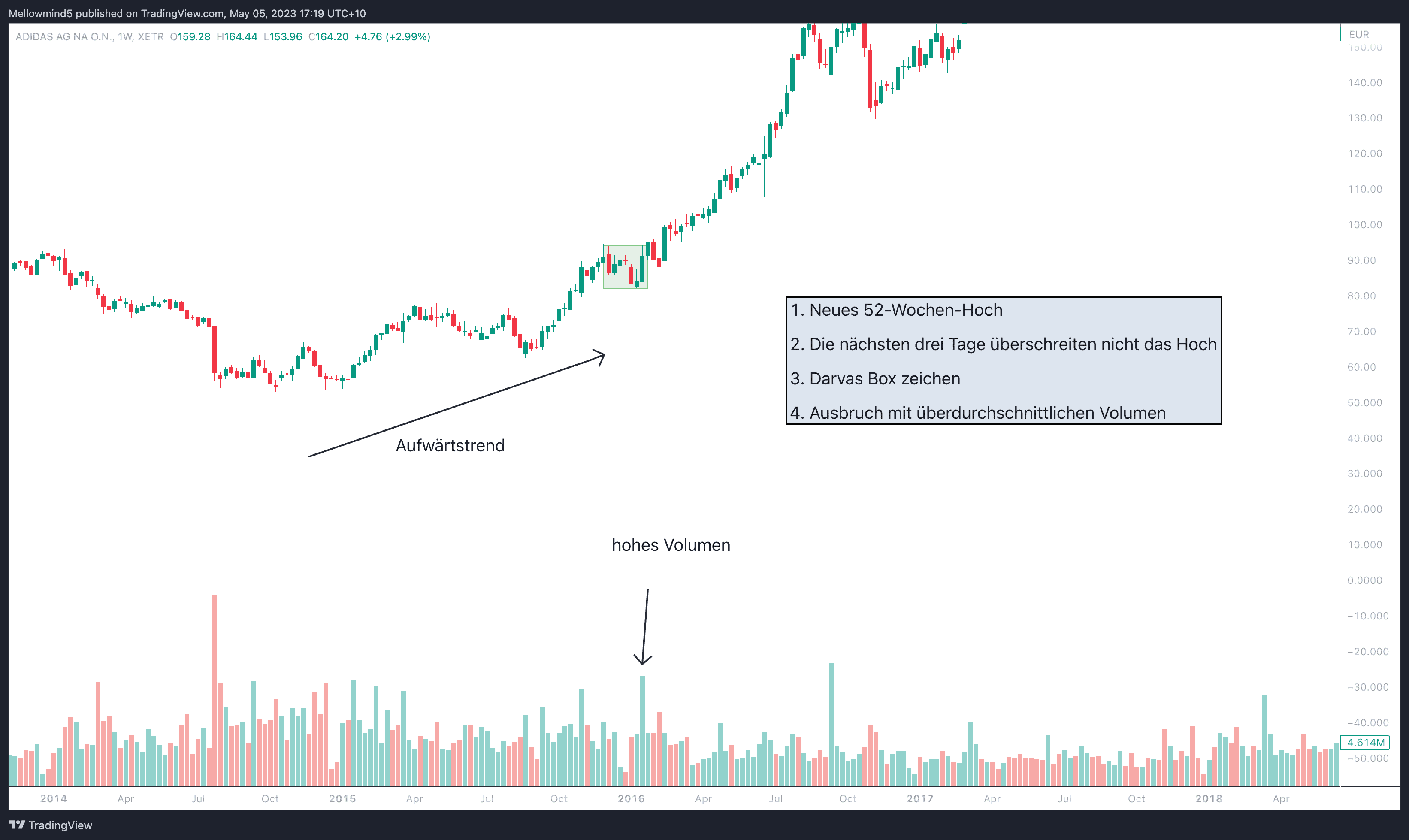 Mitte Januar 2021 brach die Aktie aus der Darvas Box aus und überwand den Widerstand bei 157 Euro bei überdurchschnittlich hohen Volumen. Dieser Ausbruch signalisierte eine Kaufgelegenheit.