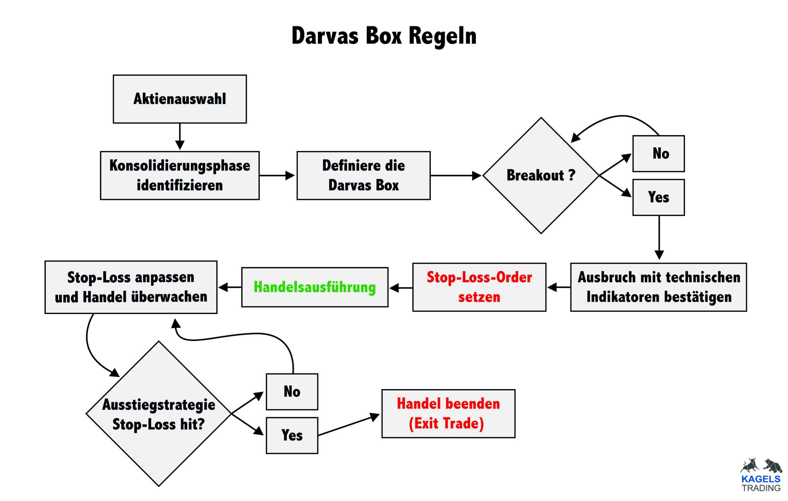 Um die Darvas Box Handelsstrategie effektiv zu handeln, können Trader eine Reihe von Regeln befolgen, die Nicolas Darvas in seinem Buch „Wie ich 2.000.000 Dollar an der Börse verdiente” beschrieben hat. Diese Regeln helfen Händlern, potenzielle Ausbrüche zu erkennen und das Risiko beim Handel zu minimieren.