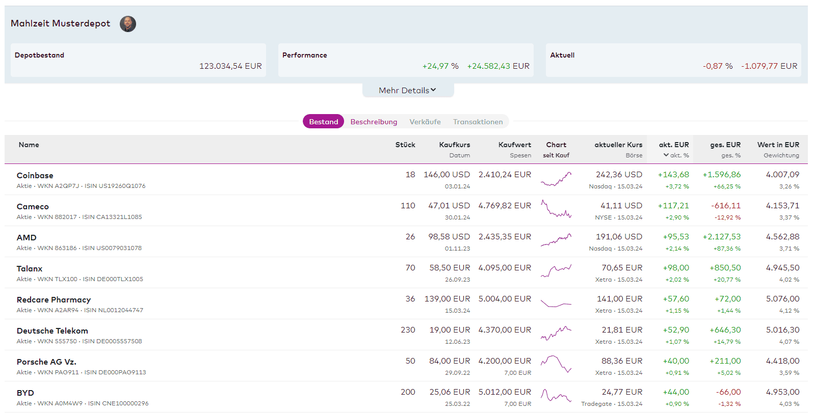 Im sogenannten „Mahlzeit Musterdepot“ kannst Du Dir jederzeit einen umfassenden Überblick über den Portfolio-Aufbau von Martin Goersch verschaffen. Der Einblick in das Musterdepot ist dabei komplett kostenlos – und kann direkt über onvista abonniert werden.