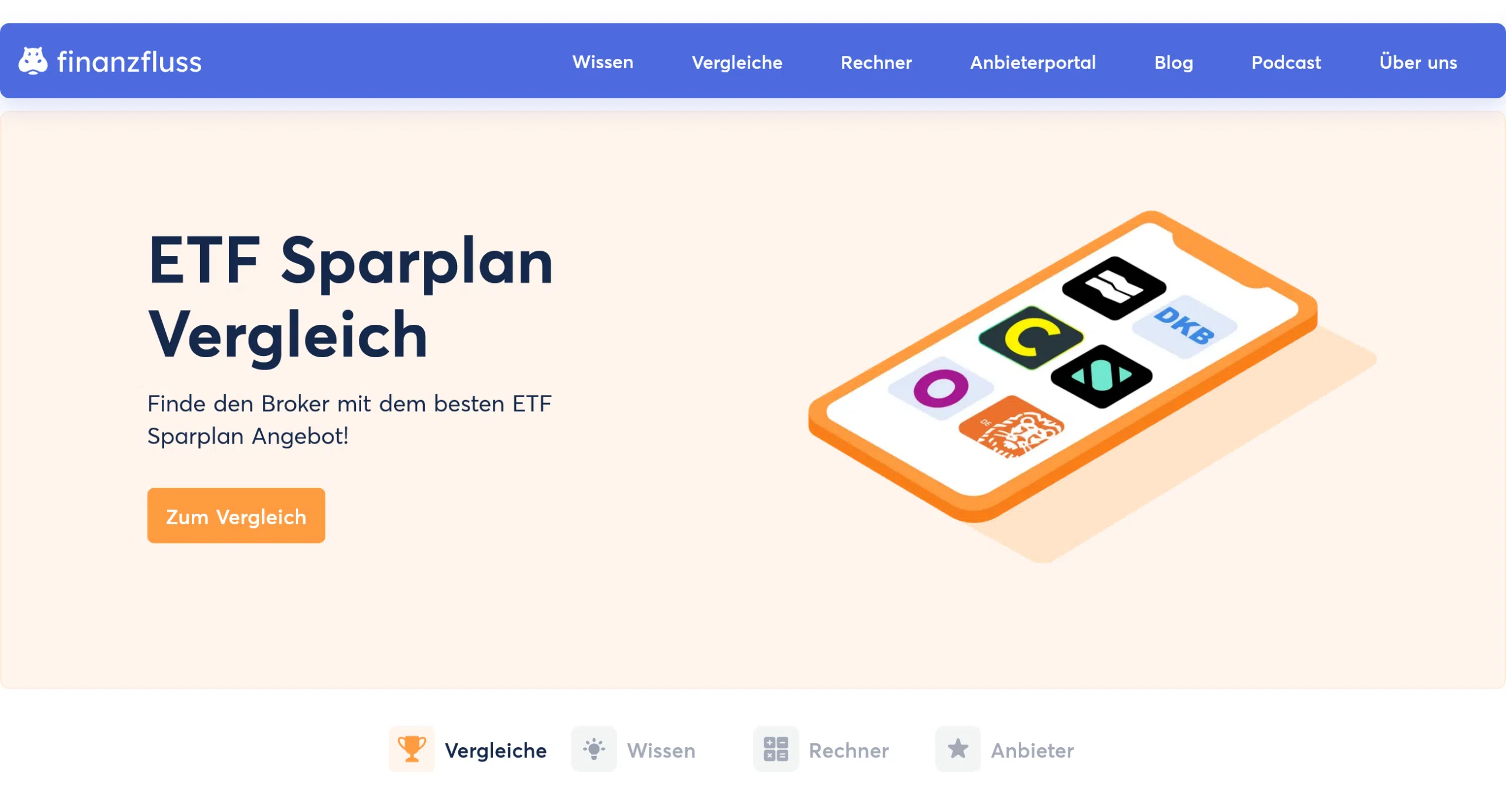 Screenshot der Finanzfluss-Webseite mit einer Illustration eines Smartphones und dem Text: 'ETF Sparplan Vergleich – Finde den Broker mit dem besten ETF Sparplan Angebot!' sowie einem Button 'Zum Vergleich'.