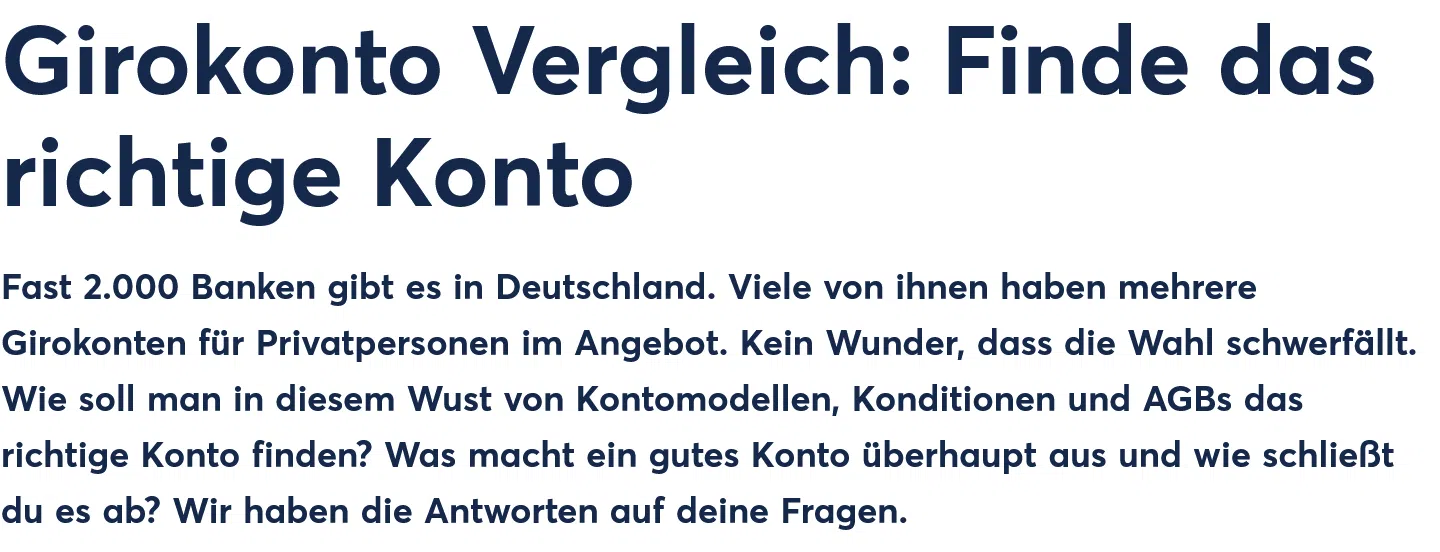 Überschrift und Einführungstext einer Webseite zum Thema Girokonto-Vergleich: 'Girokonto Vergleich: Finde das richtige Konto' mit Erläuterungen zur Vielzahl an Banken und Kontomodellen in Deutschland