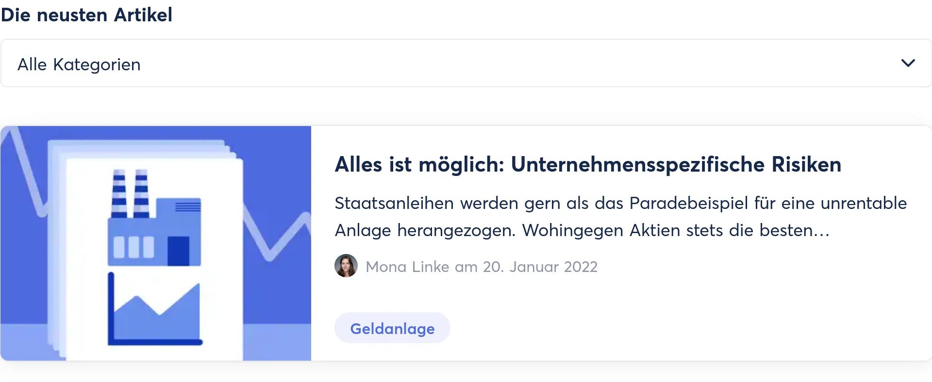 Vorschau eines Blogartikels auf der Webseite Finanzfluss mit dem Titel 'Alles ist möglich: Unternehmensspezifische Risiken', verfasst von Mona Linke am 20. Januar 2022, mit einer Illustration eines Fabrikgebäudes und eines Graphen