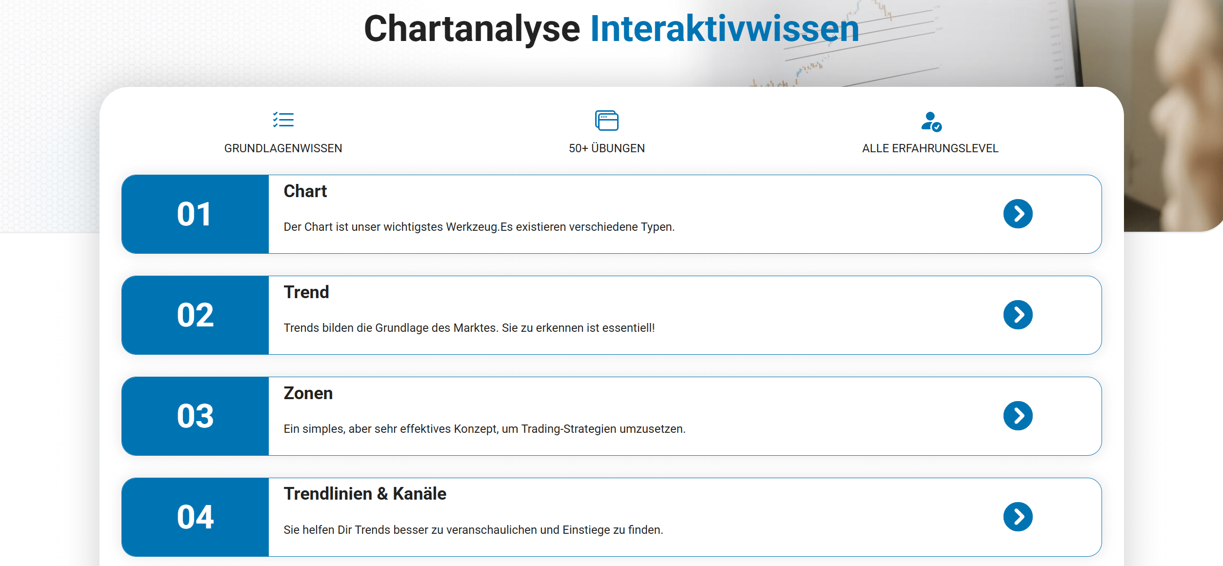 Dieses Tool ist ein interaktives Lernmodul für technische Analyse. Es führt durch zentrale Themen wie Trends, Unterstützungen, Kerzenmuster, Zonen, Fibonacci-Level und Formationen. Das Besondere: Nutzer können konkrete Aufgaben direkt im Chart lösen – ähnlich einem Lernspiel. Ergänzt wird das Ganze durch kurze Theorieblöcke und Videos, sodass sich selbst komplexe Konzepte einfach erarbeiten lassen.
