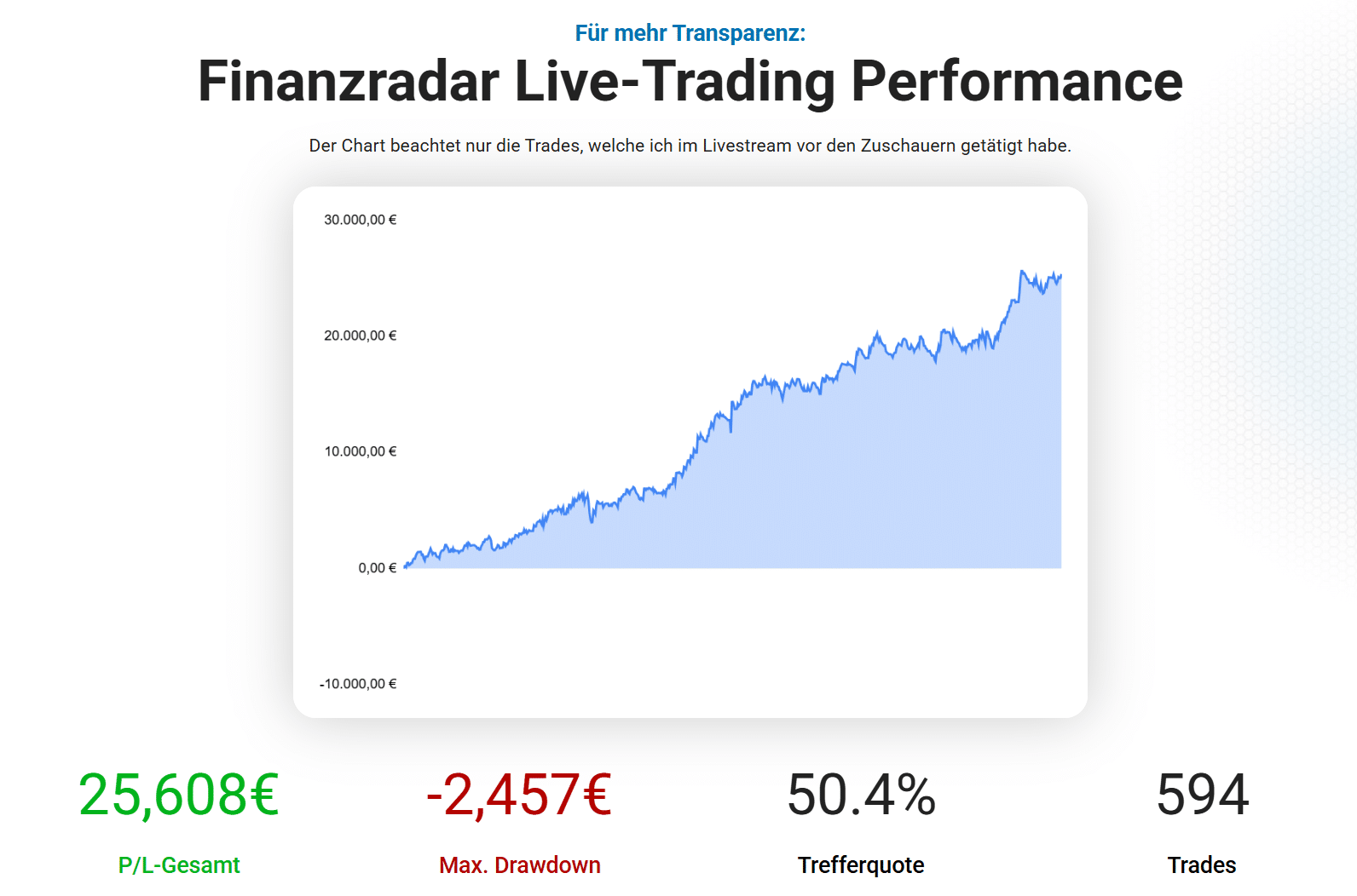 Das Besondere: Die Trading-Performance ist vollständig öffentlich einsehbar. Jeder Trade aus dem Live-Trading wird transparent dokumentiert. Damit setzt Finanzradar ein klares Zeichen in einem Markt, der oft von Intransparenz geprägt ist.