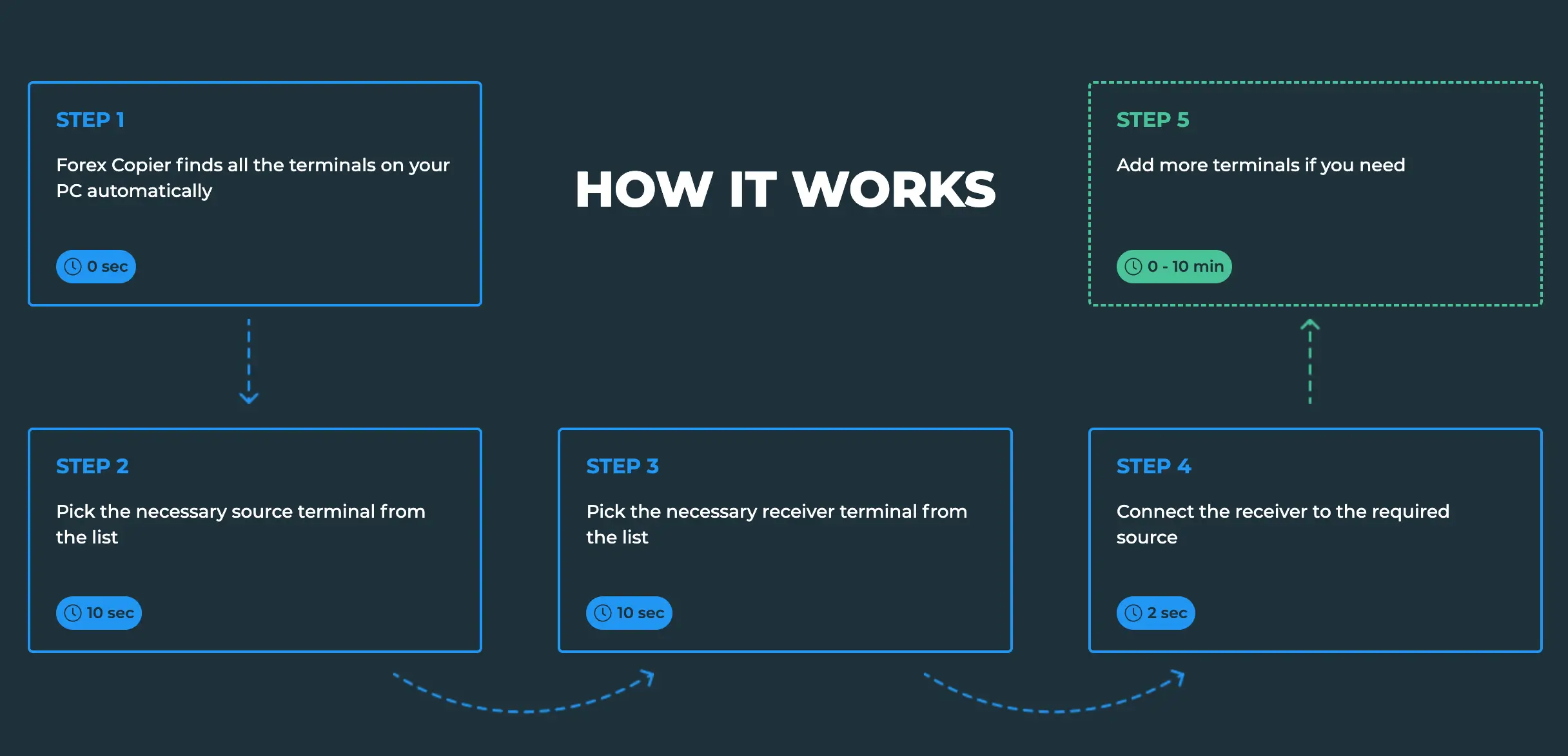 Das Bild zeigt die Funktionskette vom Forex-Trade Copier 4.