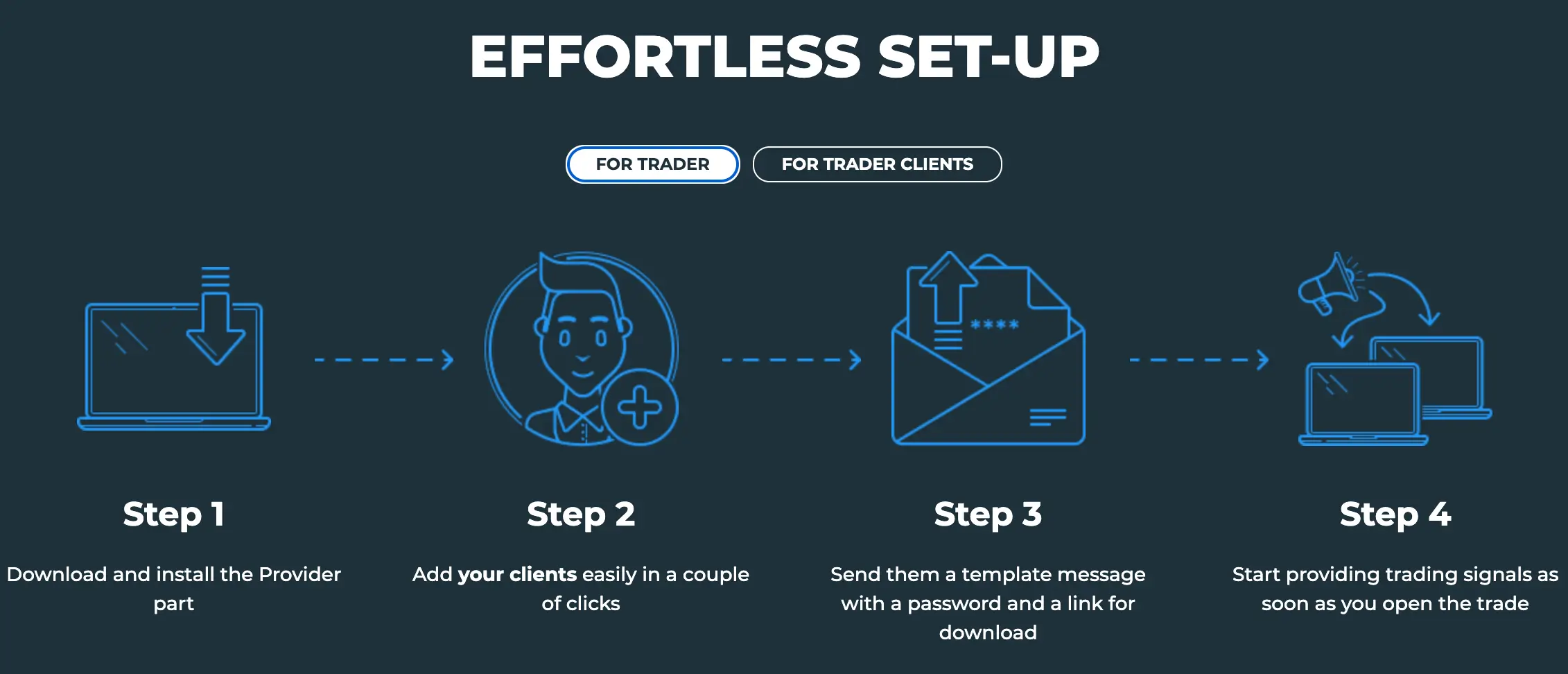 Der Forex Copier ist das ideale Tool für alle, die auf dem Forex-Markt von den Vorteilen des Copy Trading profitieren möchten. Mit seinen zwei Hauptprodukten deckt es alle Anforderungen und Konfigurationen ab: