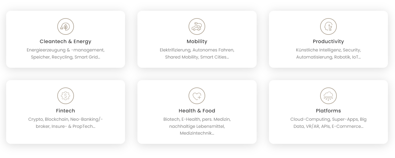 Bei der Assetauswahl seines Fonds setzt Frank Thelen dabei auf die folgenden 6 Bereiche: