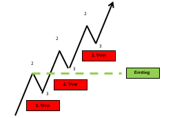 Laut Markttechnik ist dies ein Unter- oder Überschreiten des Punkt 3. Dies ist somit der Punkt, an dem der Trend nicht mehr intakt wäre. Daher wird beim Trendhandel laut Markttechnik der Stopp unter- bzw. oberhalb von Punkt 3 platziert und entsprechend auch so nachgezogen. Sobald der letzte Punkt 2 über- bzw. unterschritten wurde, ist somit ein neues Hoch im Aufwärtstrend bzw. Tief im Abwärtstrend entstanden. Dies gilt dann in der Markttechnik als eine Bestätigung für den Punkt 3 und der Stopp kann entsprechend nachgezogen werden.