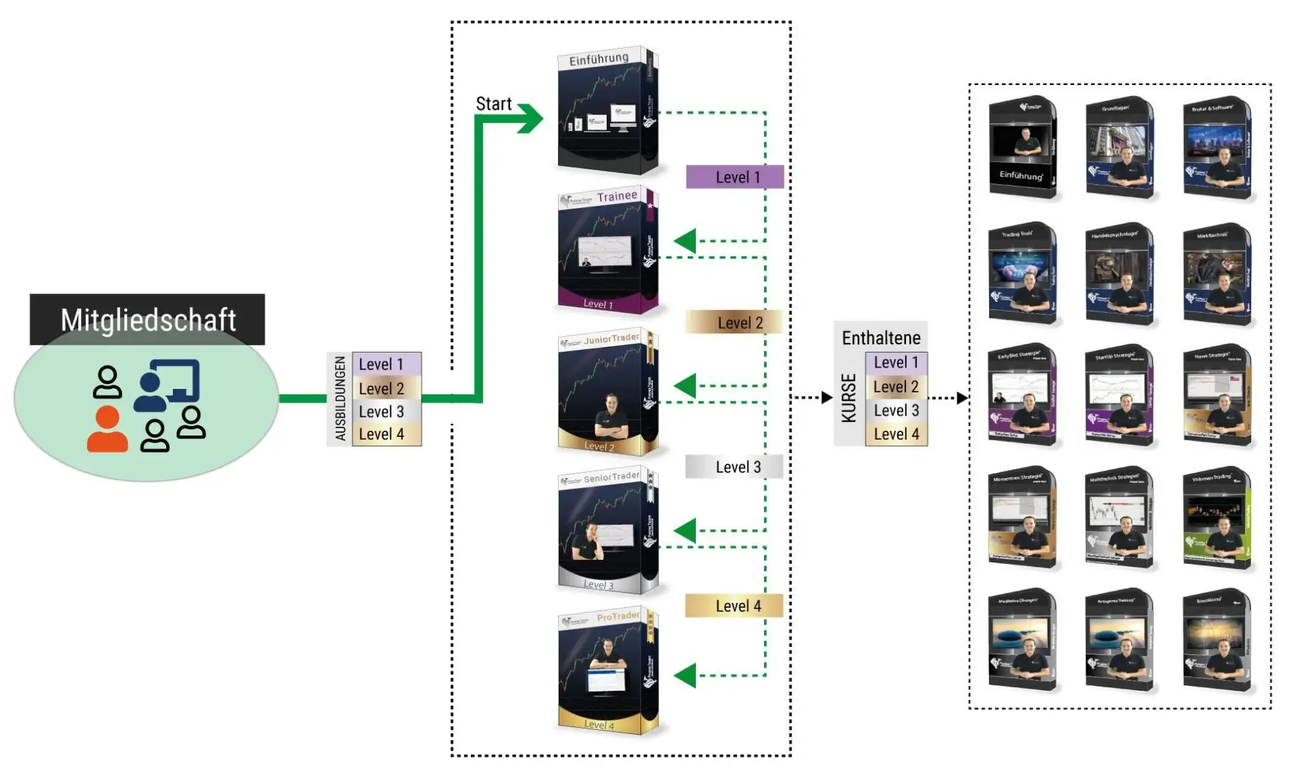 - Level 1: Trainee Ausbildung – Einführung in den Forex- und CFD-Handel. Hier werden grundlegende Ein- und Ausstiegsstrategien vermittelt, um eine solide Basis für das Trading zu schaffen.