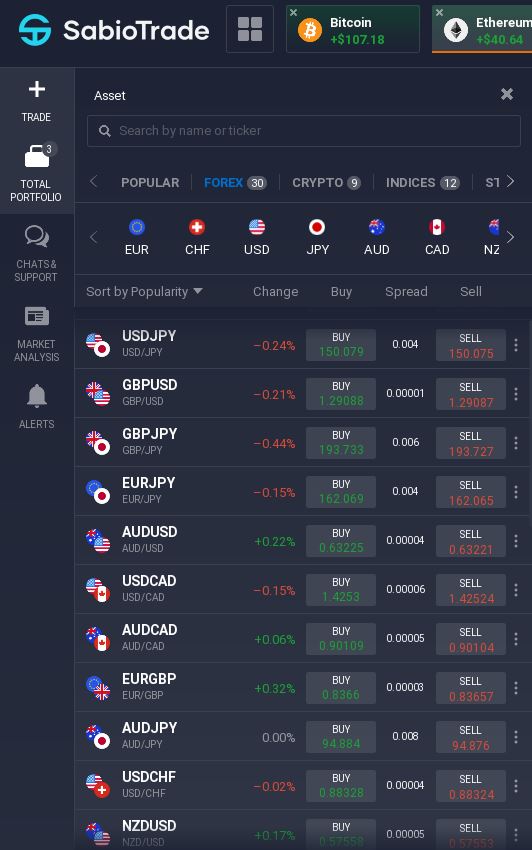- Trader können bei SabioTrade über 250 Finanzinstrumente traden – darunter Forex, Aktien, ETFs, Kryptowährungen und Rohstoffe.