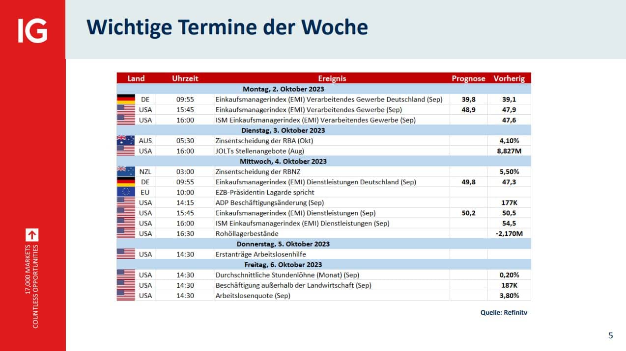 - Wichtige Termine der Woche: Als nächstes folgt eine Übersicht mit allen relevanten Terminen für die anstehende Woche in einem Wirtschaftskalender.