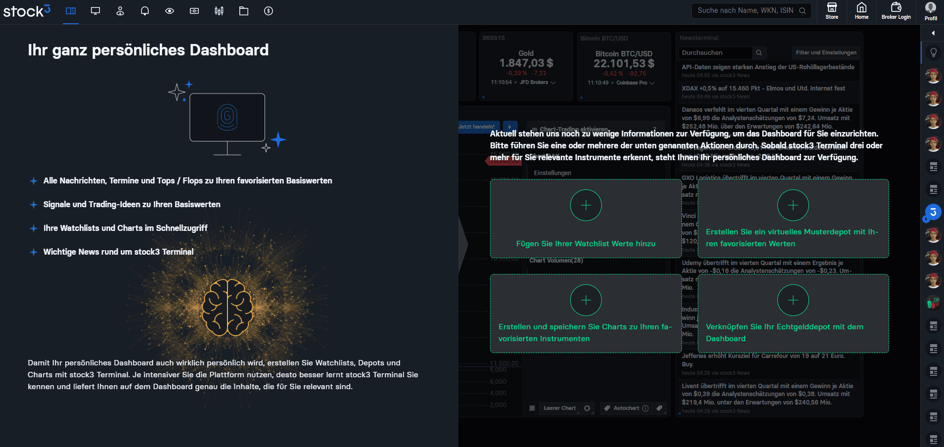 Viele Inhalte bei stock3 – wie die täglichen Newsartikel oder einige Grundfunktionen im Terminal – erfordern keine Registrierung. Denn diese stehen dir auch ohne Anmeldung jederzeit auf der Webseite kostenlos zur Verfügung.