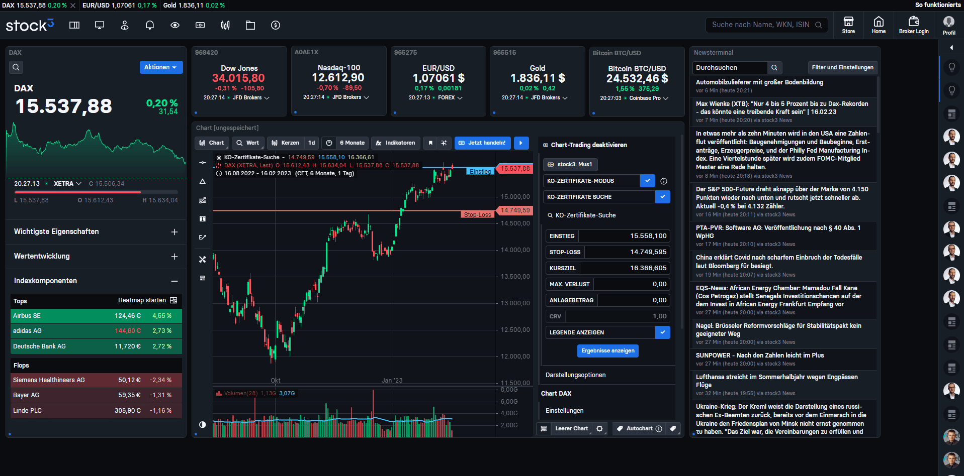 In der Mitte der Chart, links der DAX und rechts das Newsterminal. Hier kannst du entweder mit einem Demokonto handeln oder direkt mit deinem Live-Konto – über eine Anbindung an einen Partner-Broker von stock3.