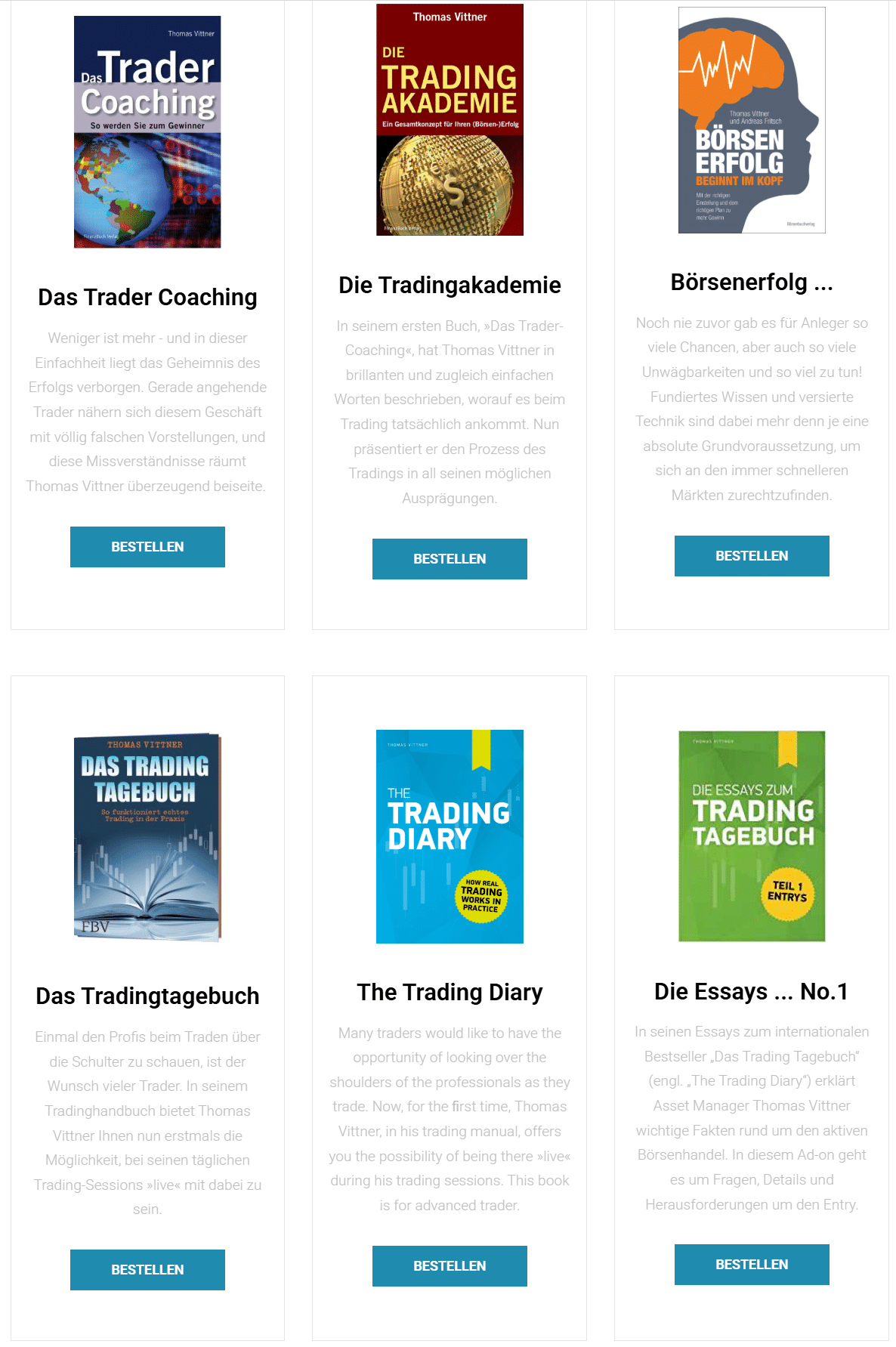 Thomas Vittner ist nicht nur Coach und Trader, sondern auch Autor mehrerer Fachbücher, die sich dem Thema Börsenhandel aus unterschiedlichen Perspektiven nähern. Seine Veröffentlichungen richten sich an Privatanleger, die ein systematisches Verständnis entwickeln möchten – ohne in abstrakte Theoriediskussionen abzudriften. Die Bücher bauen inhaltlich teils aufeinander auf und lassen sich sowohl unabhängig als auch begleitend zu seinen Kursen lesen.