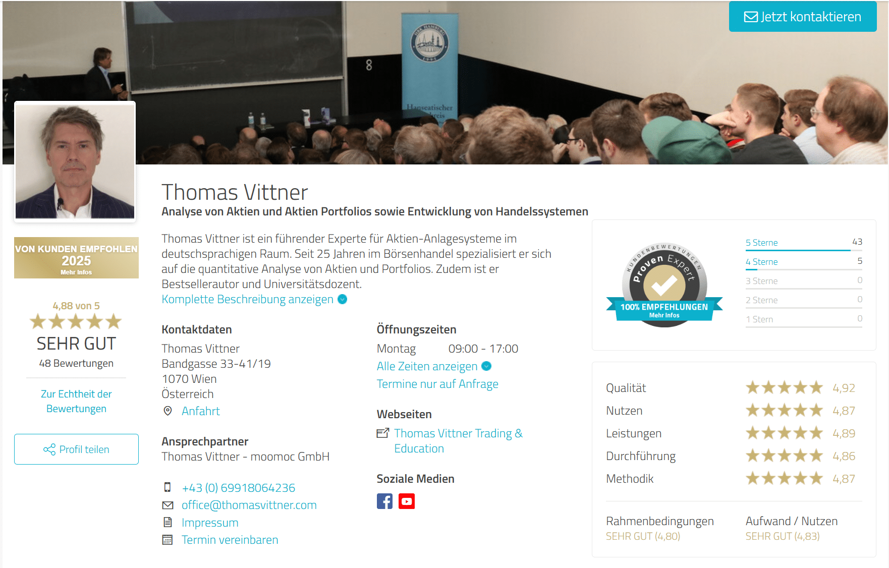 Bei ProvenExpert hat Thomas Vittner 4,88 von 5 Sternen bei 48 Bewertungen.