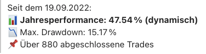 Seit dem 19.09.2022 erzielen wir mit unserer erprobten Strategie eine dynamische Jahresperformance von 47,54 % – bei einem überschaubaren Drawdown von 15,17 %.