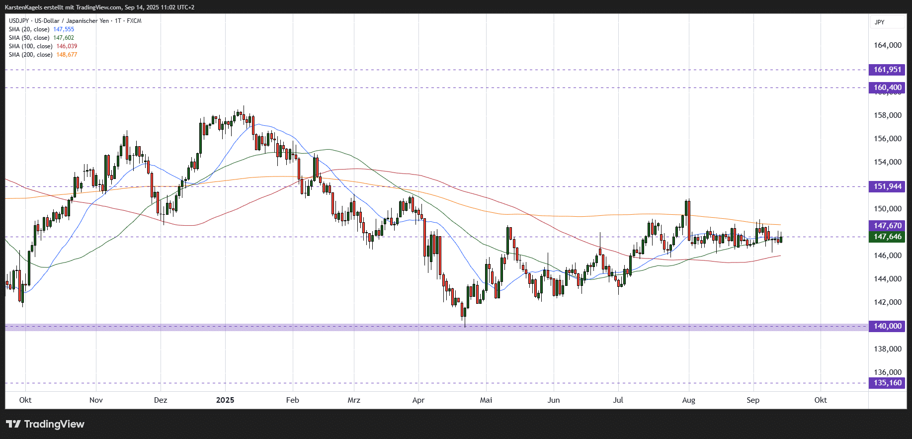 Rückblick: Der abgebildete Tageschart zeigt die Kursentwicklung des Währungspaares USD/JPY seit Mitte 2024. Der Kurs ist in der Rallye des vergangenen Jahres auf Widerstand im Bereich von 160 Yen getroffen, wo auch das Jahreshoch aus 1990 liegt. Der dort einsetzende Korrekturimpuls hat die Jahresgewinne abgegeben und im September ein lokales Tief bei 139,57 gesetzt. Die folgende Zwischenerholung konnte die vorangegangenen Hochs nicht wieder erreichen und pendelt seit März 2025 in einer Schiebephase zwischen der 140- und der 150-Yen-Marke.